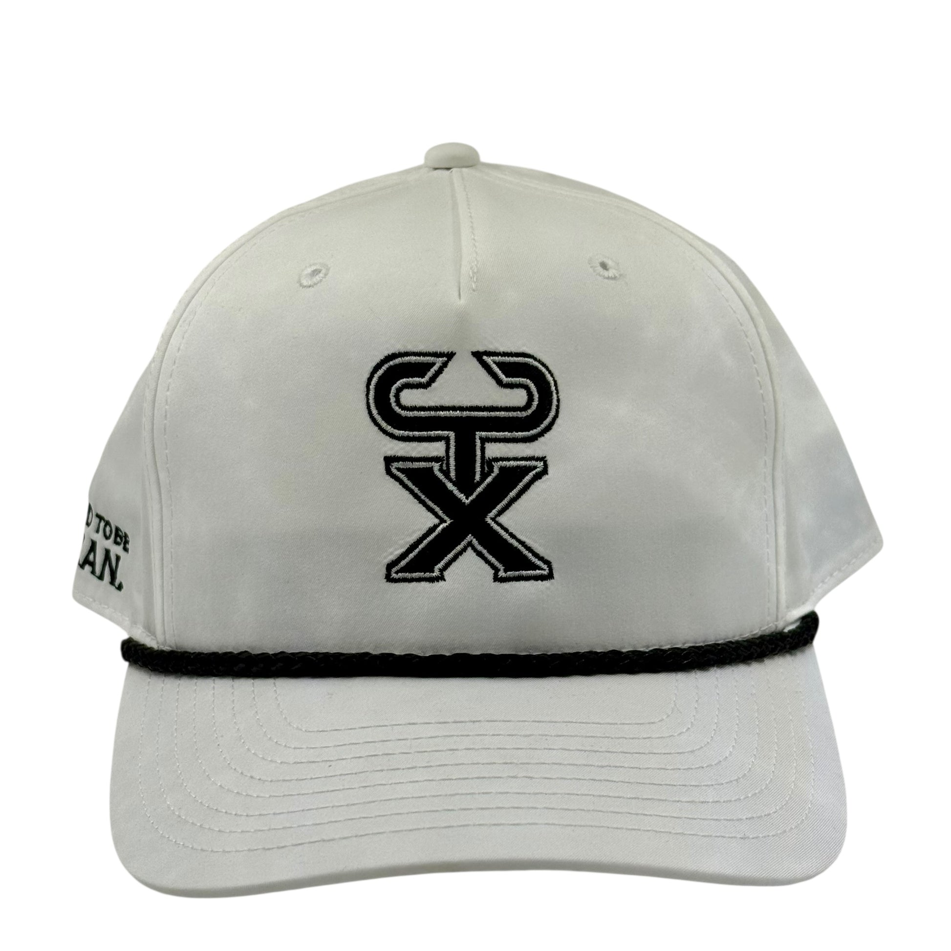 Full Moon features a clean bone-white crown with black embroidery and rope detailing — a sharp contrast look that feels like moonlight stretching across open land.